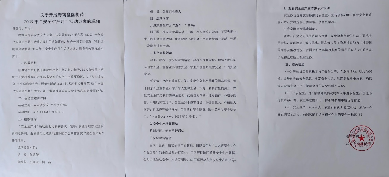 根據(jù)國家、省、市、區(qū)相關(guān)文件精神,結(jié)合公司實際,海南皇隆制藥股份有限公司制定了2023年“安全生產(chǎn)月”活動方案,并開展了以“人人講安全,個個會應(yīng)急”為主題的系列活動,進一步提升了公司全員安全意識和應(yīng)急處置能力。
